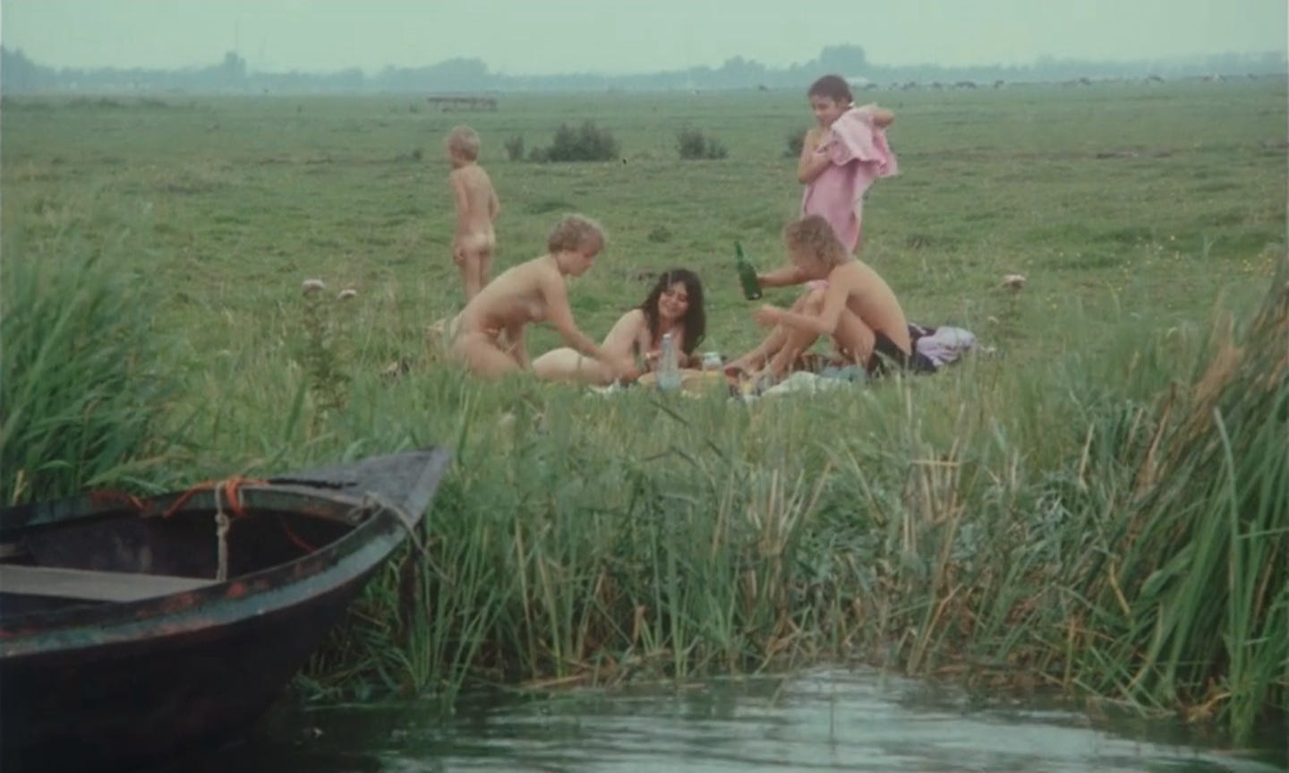 Ad and Eve begin divorce proceedings, at which point the film becomes legible as a divorce drama. Though Ad claims he’s being discriminated against because he’s a man and begins hurling vitriol at Eve during their court session, the judge grants Eve custody of the children, and they come to live on her quaint Dutch houseboat. Liliane is there too, sometimes, though she doesn’t care much for children. They go on a picturesque picnic with the kids and one of their other lesbian friends, and everyone frolics naked in the field. It’s all very bucolic, like an old painting.