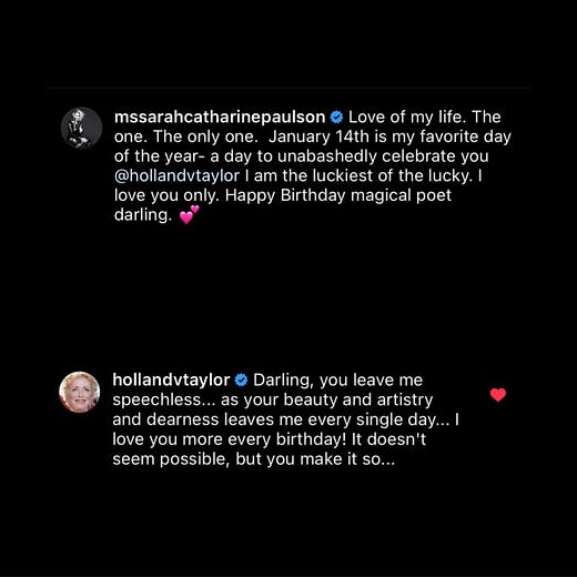 It was Holland Taylor’s birthday on Friday, and, as we’ve come to expect, Sarah Paulson penned a heartfelt birthday letter to her septuagenarian girlfriend and posted it on Instagram. Read Paulson’s birthday message – and Taylor’s similarly heartfelt response – below.