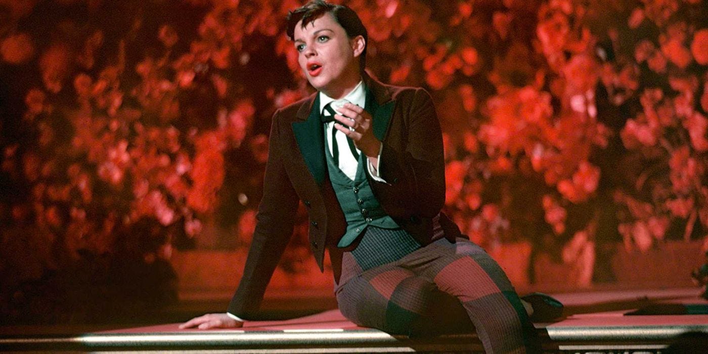 The contrast between the intimate, confessional nature of the songs and the public-facing condition of the speaking portions represents the inside-outside conflict queer people face. In many cases, it's as if the singer is telling the audience a secret or revealing how they really feel. It’s a fairly literal embodiment of “code-switching.” The musical’s queer appeal, then, stems from its “sense that everyone has two identities – the more fantastical, seemingly artificial one being, ironically and excitingly, the more honest.” The musical’s departure from reality also reflects a departure from dominant social norms, such as heteronormativity. Koresky argues that Garland “both embodies and transcends the movie musical.” Her astounding voice gives the appearance of a larger-than-life, one-of-a-kind superstar, while her tragic personal life reminds us that she was as fragile as any of us.