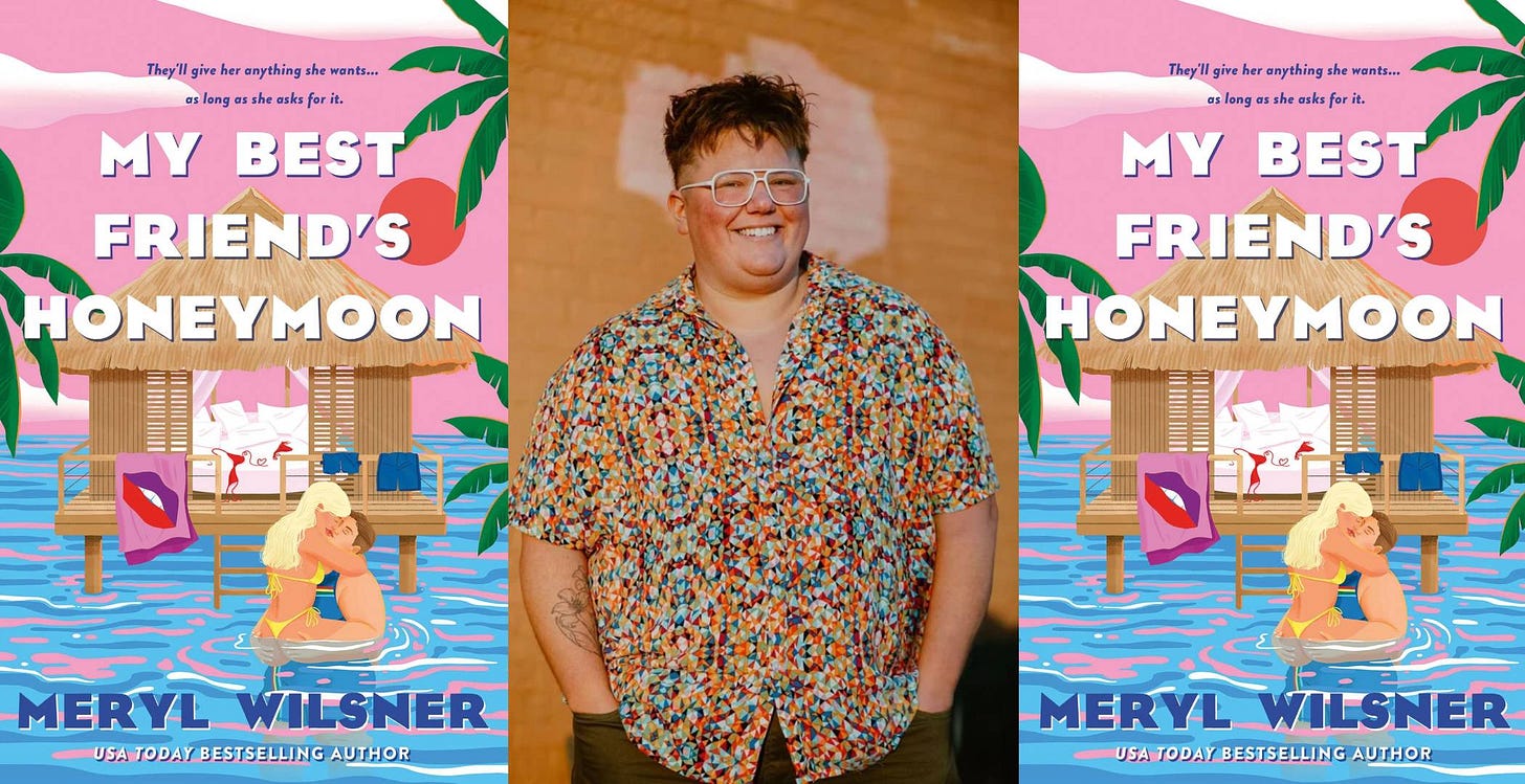 Today, I’m thrilled to bring you an interview with romance writer Meryl Wilsner. If you’re a fan of sapphic romance novels, you’ve likely heard of Wilsner’s books. They’ve written four novels: Something to Talk About, Mistakes Were Made, Cleat Clute, and their most recent book, My Best Friend’s Honeymoon. Their books are funny, sexy, and aspirational, yet still grounded in a sense of emotional truth.