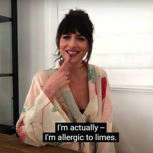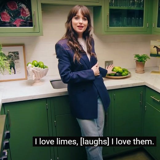 The next most important thing that happened this week involved Dakota Johnson. First, shocking the whole nation, Johnson revealed on Jimmy Fallon that her infamous love of limes (as seen in her iconic Architectural Digest video) was a lie, and that she is actually allergic to limes and they were put in her house as set dressing. I can’t fully get into the internet’s love for Dakota Johnson right now (see Iana Murray’s article on the subject), but her AD video and her famous confrontation with Ellen about her birthday party are what have endeared her most to the public recently, so the fact that she lied about loving limes feels like a deep betrayal. (If we don’t have Dakota Johnson and her limes, what do what have???)